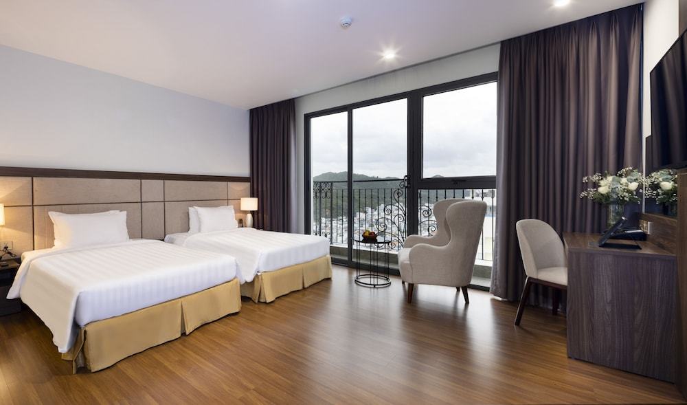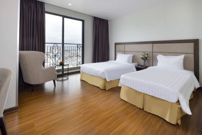 The Daphovina Hotel is a hotel. Daphovina Hotel is a 4-star international hotel located in Nha Trang, Khanh Hoa Province, near the beach. It features 135 air-conditioned rooms with private balconies, offering city or sea views. Each room includes complimentary Wi-Fi, a 43-inch LCD TV with cable, a minibar, a refrigerator, and a private bathroom with complimentary toiletries. The hotel offers a restaurant, poolside bar, sky bar, 24-hour room service, a swimming pool, a fitness center, a sauna, and a luxury spa. Additional amenities include a business center, conference space, meeting rooms, concierge services, a banquet hall, and a 24-hour front desk. Bai Duong Beach is nearby. An airport shuttle is available for a surcharge, and free self-parking is provided.