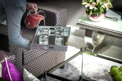 This elegant, fashionable two-bedroom apartment is located in the Central area of Dubai. With two stories, the first thing you will notice are the floor to ceiling windows with magnificent views of the city from all rooms in the apartment. A classy, fashionable atmosphere is created by the white porcelain tile, dark wood furniture tones, and magnificent glass work showcased on the staircase and chandeliers. Whether you're staying in Dubai for a work conference or searching for an elegant place for your family and friends to stay at on holiday, Dream Inn at Central Park is a perfect choice! Walking into the two-story apartment, the large floor to ceiling windows will immediately draw your attention. No matter what room you are in, you will always have stunning views of Dubai accented with a heavenly glow from the sun rays.