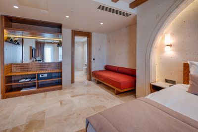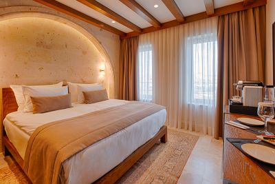The total number of guest rooms is 77. In 2023, our hotel was designed with the combination of the spirit and elegance of Cappadocia and opened to host the appreciation of our valued guests, Our hotel, located in the center of Ürgüp, where luxury and comfort coexist, overlooks Ürgüp with its unique view due to its location. Starting the day by enjoying the balloon cruise with our unique view at sunrise on our observation terrace, and sipping your wine at the most peaceful time of the day at sunset will make your pleasant moments unique. Our 3 meeting rooms, lobby area, game room, yoga room, fitness room, spa service and indoor pool are at your service where you can plan your special days. We enable you to spend your holiday to the fullest with a very special and wide range of activity services, where you can collect pleasant memories with your family or alone. You can contact us at any time for all our services and events. Discover Our Rooms “Stone mansion” architecture unique to Cappadocia With its strong character and associative imagery, we aim to make our guests spend time in a local mansion, not in a city hotel.
