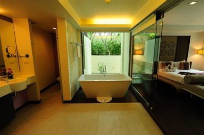 This beach resort is located on Hua Hin Beach, not far from Hua Hin railway station and is easily accessible by car. Don Mueang Airport is located some 212 km from the hotel.This resort and spa is what everybody is looking for in a tropical resort hotel - sea, sun and swimming to make spirits soar and a light, flowing, relaxed environment to soothe the soul. The resort has a total of 105 rooms, suites and villas and constitutes a thoroughly 21st century establishment where guests can enjoy a truly stylish and modern living environment. Laid-back for young families, this is a tropical resort that also offers adventure around every corner. The architects of the hotel have created a fusion experience that unites luxurious living with nature. The resort offers flowing architectural configuration, which leads all guests instinctively from one experience to another in a hypnotically relaxing sanctuary. Guests are welcomed to the resort in the hotel lobby which has a safe. Other on-site amenities include a hairdressing salon, a children's playground, cafГ©, bar, restaurant, conference facilities and WLAN Internet access. Those arriving by car may also leave their vehicle in the resort car park.All room categories offer individually regulated air conditioning, cable TV, a hairdryer, porch swing, telephone, toiletries, coffee maker and fridge. Further standard in-room facilities include rain shower, hot tub (in some rooms), a minibar, safety deposit box, DVD/CD/radio player and Internet access.