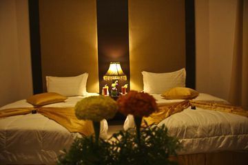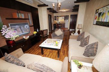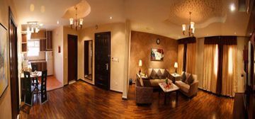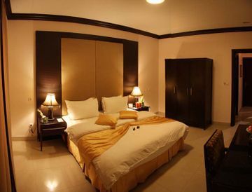 20 minutes from the center , 45 minutes from Riyadh International airport 2 bedroom suites consist of 2 bedrooms and 1 living room all furnished with modern style furniture, ceramic bath and seating area . Hotel coffee shop serves light snack and soft drinks only outside catering is permitted. Modern light colour building. Medium in size with a coffee shop which has free internet facility ,large seat spread around. This is very good hotel suites suitable for families and business travellers, RD06/08