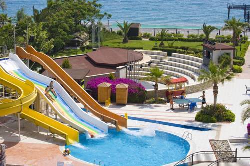 Opened in 2003, this hotel comprises a total of 213 rooms spread over 5 floors of which 2 are suites. The fully air-conditioned exclusive hotel offers access to various facilities including a foyer with a 24-hour reception desk, a currency exchange counter, a lift, a kiosk and a safe. The hotel also has its own a bar, hairdresser's salon, a games room, shops, a nightclub, an auditorium and an air-conditioned restaurant (with a non-smoking area). Business guests may find the conference room and public Internet terminal to be of use. A laundry service and medical assistance are also available. Furthermore, the hotel also affords its own playground and kids' club. Guests arriving by car can park in the hotel car park. This exclusive beach hotel is centrally situated just 100 m from links to the public transport network. A diverse range of shopping facilities, numerous restaurants, cafГ©s, bars aplenty and a variety of entertainment venues are to be found in the immediate vicinity. Antalya airport lies 90 km away and can easily be reached by car or the affordable public transport. The exclusive rooms come with an en suite bathroom with hairdryer, a direct dial telephone, satellite/cable TV, a minibar, a double bed, a hire safe and air conditioning (centrally operated). The rooms additionally feature either a balcony or a terrace. Guests may make use of the heated swimming pool with children's paddling areas, poolside snack bar and wonderful sun terrace as well as a steam bath, a sauna as well as massage and spa treatments for which additional fees apply. Sports enthusiasts also have the opportunity to play a game of tennis, basketball, beach volleyball, volleyball, basketball, badminton, miniature golf, billiards/ snooker, bocce or table tennis as well as use the gym. Gymnastics and aerobics may be enjoyed by those wishing to keep fit. A seasonal entertainment programme for guests both young and old rounds off the offerings. Dinner may be taken Г la carte. It is possible to book all-inclusive stays.