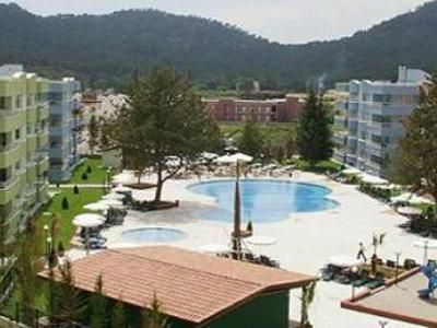 The apartments are located in the centre of Kemer and are 45 km from the Antalya city centre. The complex is 55 km away from Antalya Airport.The hotel is the perfect choice for those seeking a relaxing luxurious break in Turkey. In addition to a lobby area with 24-hour reception and check-out services, a hotel safe and currency exchange facilities, amenities available to guests at this 88-room aparthotel include a cafГ©, mini supermarket, bar, disco and a games room, as well as a restaurant. WLAN Internet access and a laundry service are available for a fee. Younger guests can let off some steam at the children's playground. Guests arriving by car may use the hotel's parking facilities.All comfortable rooms are air-conditioned and provide a bathroom with a shower and a kitchenette with an oven. Other amenities include a telephone, satellite TV, a mini fridge and a balcony. Further standard features of all accommodation units include centrally regulated air conditioning and heating units, a safe and a balcony/terrace.During a stay, guests can enjoy using leisure facilities such as table tennis, tennis, aerobics and beach volleyball. Evenings can be spent at the hotel bar and restaurant, followed by a dance in the hotel disco. Further facilities include a swimming pool in the hotel grounds with children's section and a poolside snack bar. Sun loungers and parasols are laid out for use by the water's edge. The more adventurous at heart can try their hand at various water sports, such as banana boating, waterskiing, jet skiing, motor boating, diving, windsurfing, sailing, catamaran boating and canoeing (fees apply to all). Guests looking to stay in shape can take part in aerobics sessions or pay a visit to the hotel gym for a workout.Breakfast, lunch and dinner are available (additional charges apply).