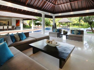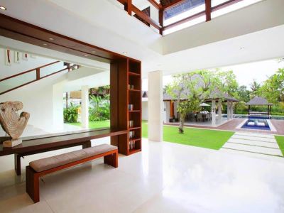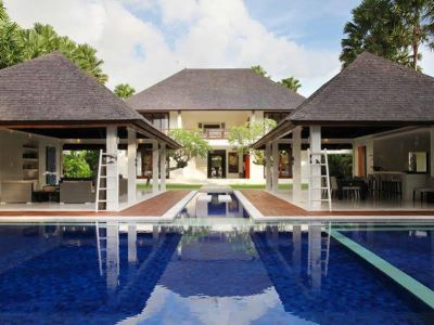 The contemporary styled Villa Asante, complete with four bedrooms and a swimming pool, is located just 200 metres from the beach in the fishing village of Canggu on Bali is southwest coast. Designed by international architect Ross Franklin, with interiors by Dean Kempnich, this delightful property is a study in perfect symmetry, comprised of three buildings set within an expansive walled garden, together with a lap pool and bale relaxation pavilion. The main two storey building incorporates the bedrooms and a cosy TV room, while the two, single storey, open sided pavilions house the living room and the dining area and kitchen. Villa Asante is ideal for families or groups of friends. There are plenty of relaxation areas, so guests will always find a private spot for peace and quiet, with a choice of air conditioned comfort or tropical open air living.