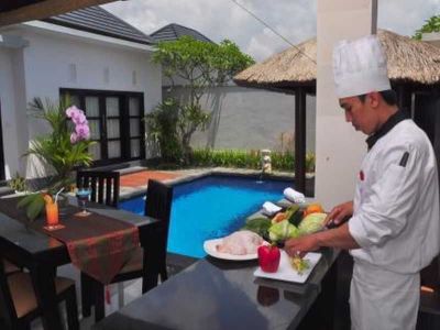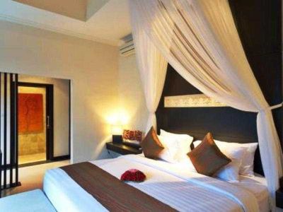 Located at the heart of Seminyak area, the hotel is just a few minutes from the bustling entertainment and shopping area and 30 minutes by car to Ngurah Rai International Airportodern. This minimalist, exclusive villa's good location is nestled among upscale shops and Bali's best dining scene and nightlife entertainments. Each villa comes with Balinese entrance gate, living area pavilion and dining area with kitchenette. Guest can enjoy the utmost privacy, screened from outside by a Balinese wall, lush garden and with access from the private pathway to the entrance court yard. Spa services are available. Breakfast, lunch and dinner are available.
